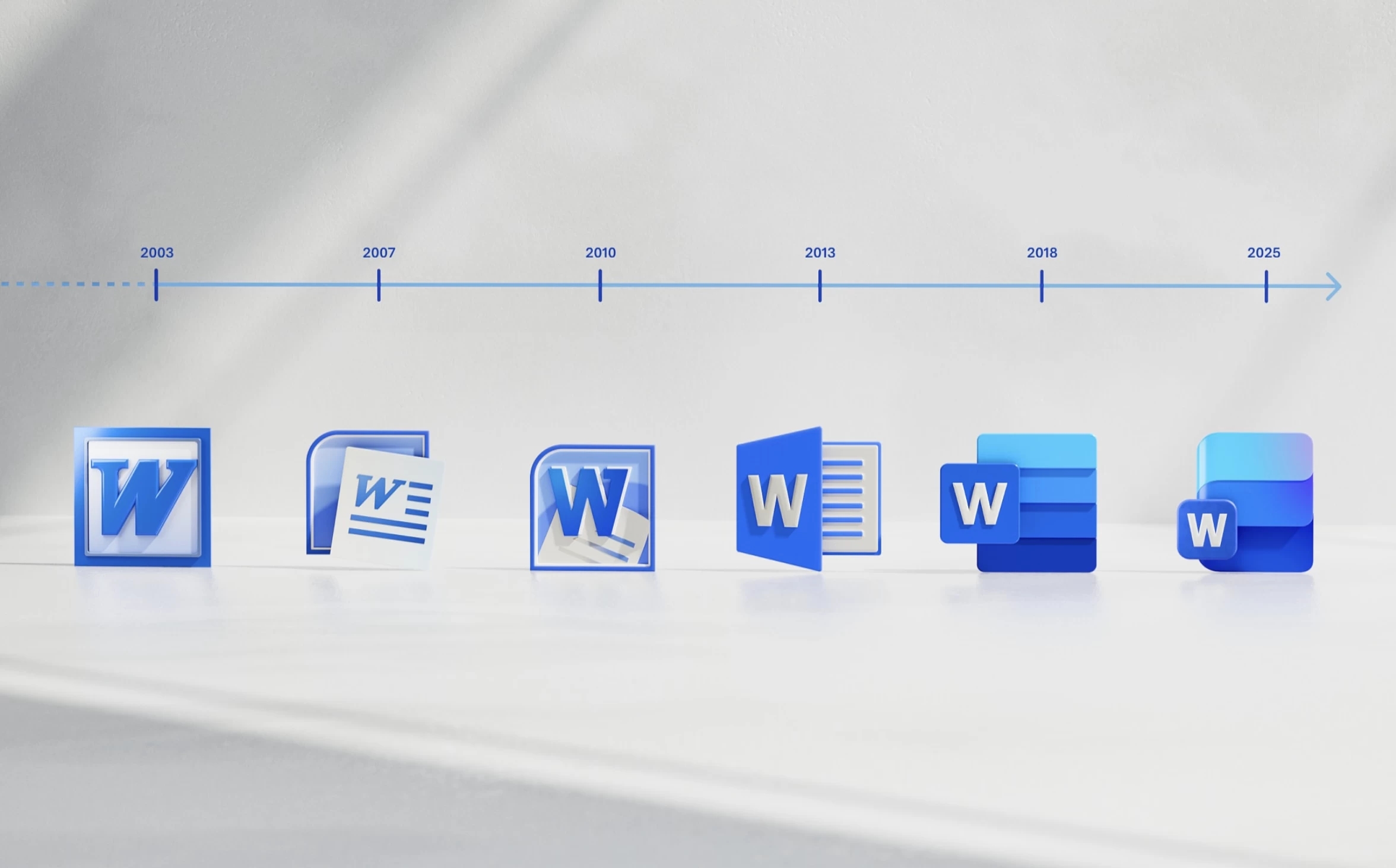 Para além dos designs rejeitados, a Microsoft publicou também uma linha do tempo que ilustra a evolução do ícone do Word desde 2003 até 2025. A imagem mostra a transição do logótipo através de várias fases de design, desde o simples esqueumorfismo, passando por uma fase mais simplista, até chegar ao atual estilo "Fluent".