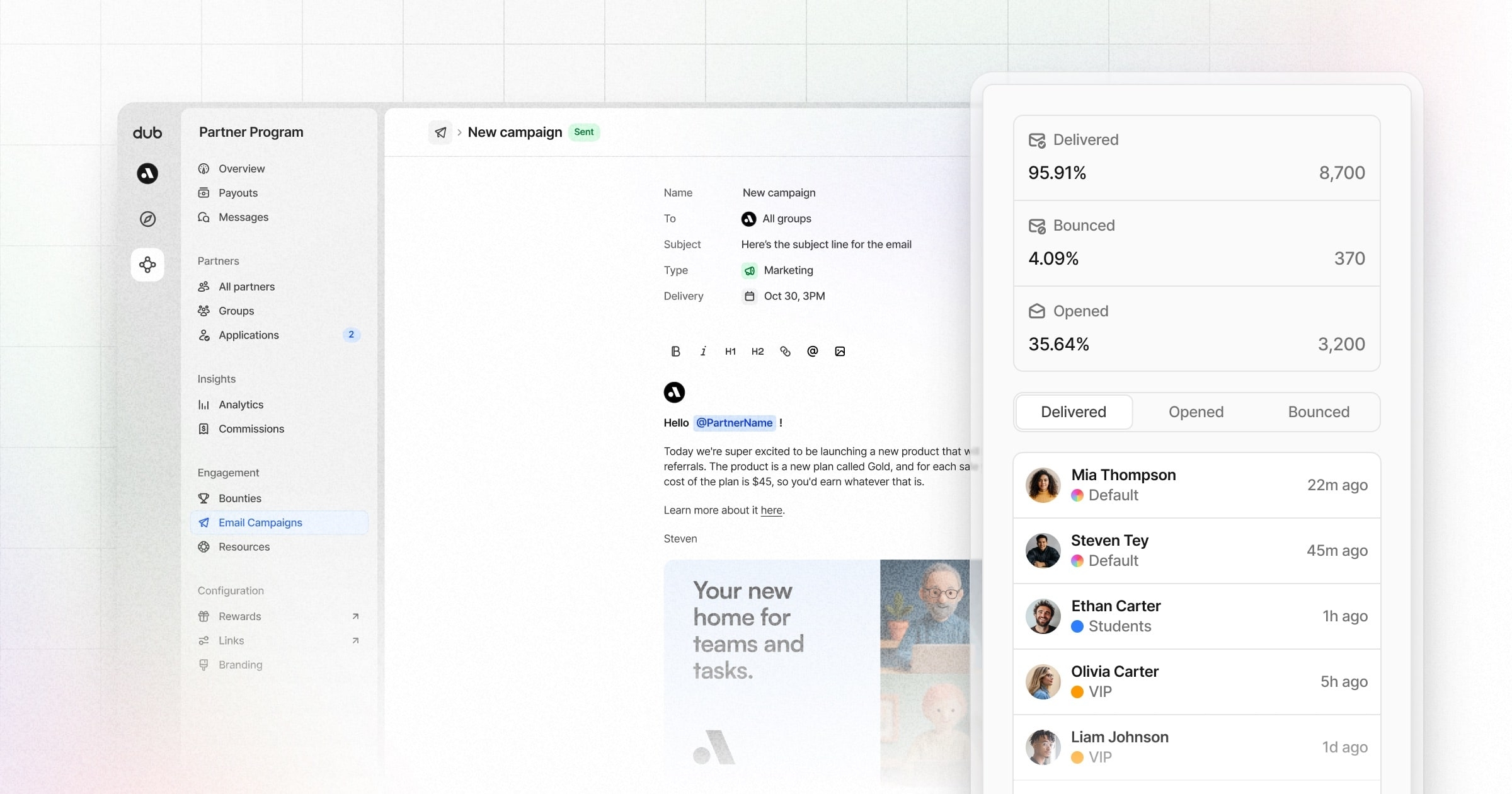 A plataforma Dub.co anunciou o lançamento das "Email Campaigns", uma nova ferramenta integrada desenhada para permitir o envio de emails de marketing e transacionais diretamente aos parceiros. Esta funcionalidade responde a pedidos de longa data dos utilizadores do "Dub Partners", que procuravam uma solução de comunicação por email nativa na plataforma.
